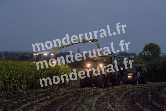 Un agriculteur normand procede a la coupe du mais pour en faire de lensilage. Une ensileuse et huit tracteurs sont implques. Saint-Martin-des-Besaces, samedi 4 octobre 2025.